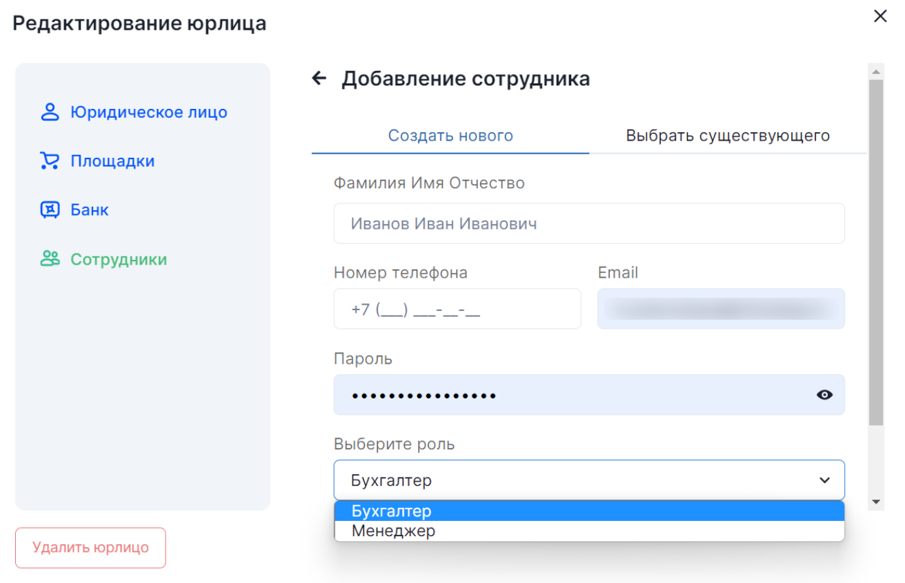- Назначьте роль из выпадающего списка — бухгалтер или менеджер.