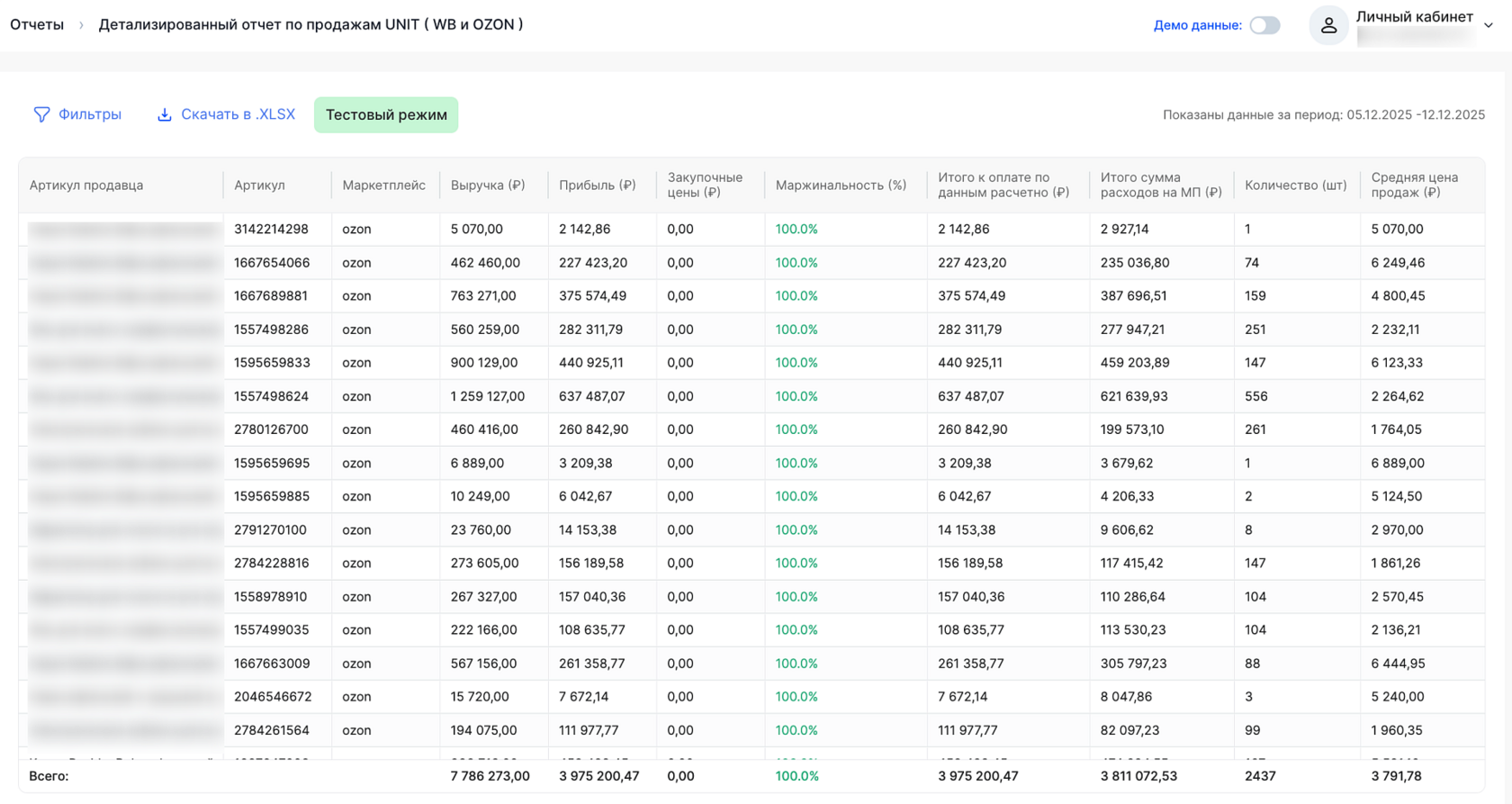 Что показывает:Отчёт отображает маржинальность (%) по каждому товару (SKU) за выбранный период на маркетплейсах WB и OZON: