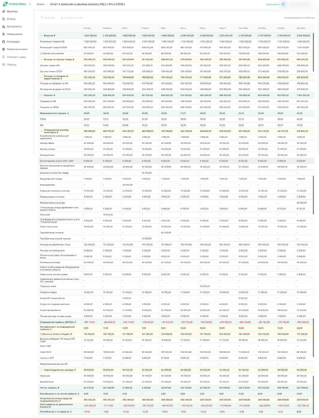 - видеть реальную прибыль, маржинальность и структуру расходов;