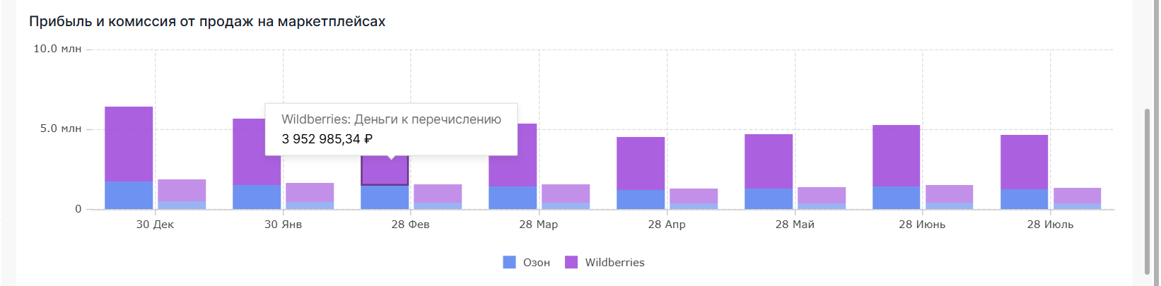 Динамику чистой прибыли и суммарной комиссии, удержанных маркетплейсами (Wildberries и Ozon) за выбранный период. Данные отображаются по месяцам в разрезе маркетплейсов с возможностью фильтрации по юрлицам.