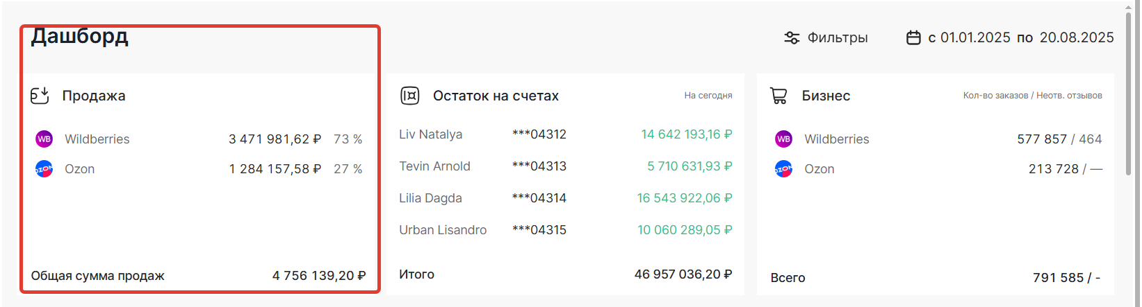 Помогает быстро понять, какой маркетплейс приносит больше денег и как распределяется выручка между юрлицами, и корректировать стратегию продаж.