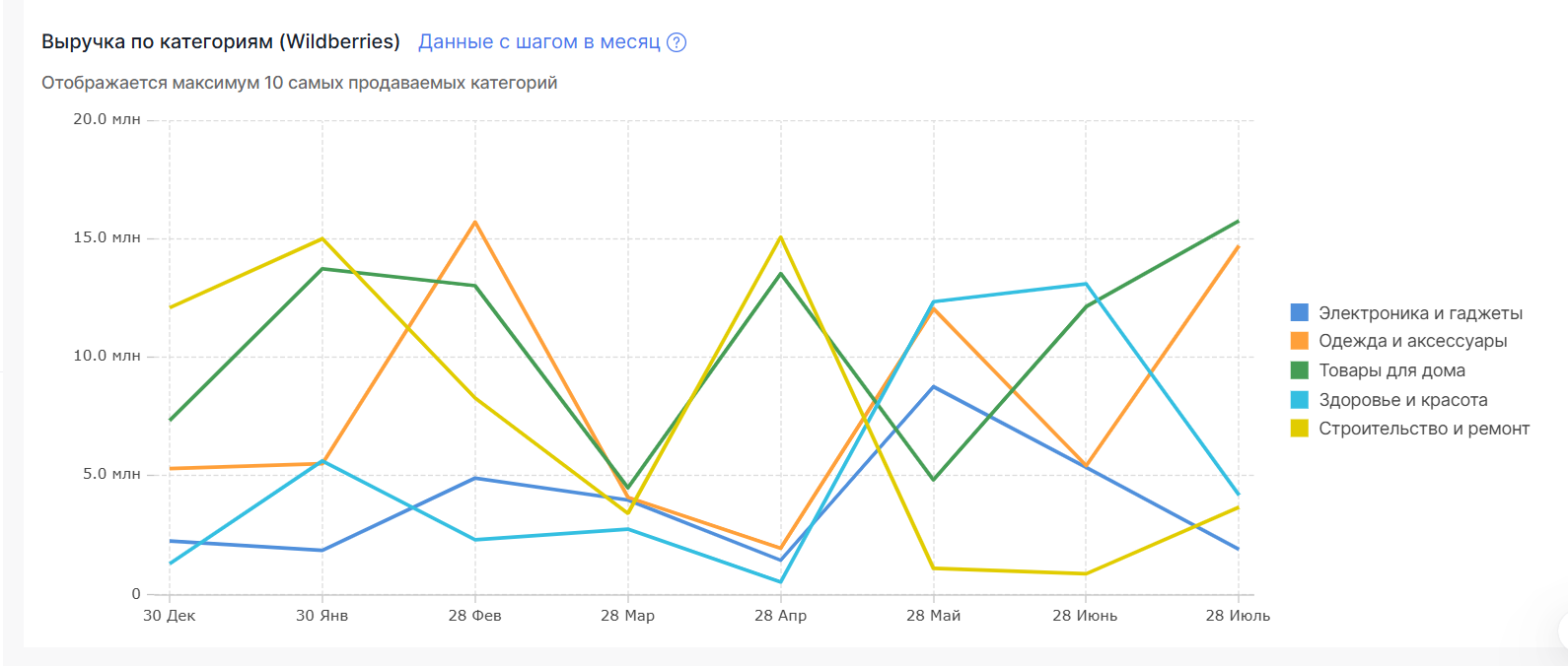 Динамику продаж на Wildberries по ТОП-10 категориям товаров за выбранный период.