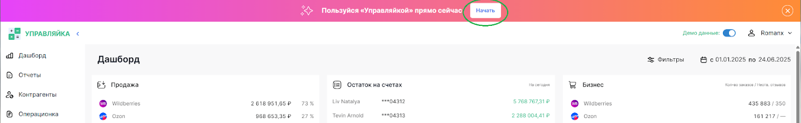 По завершению онбординга система предложит вам оставаться в демо-режиме или подключить собственные данные (настроить аккаунт), чтобы система считала реальные показатели.