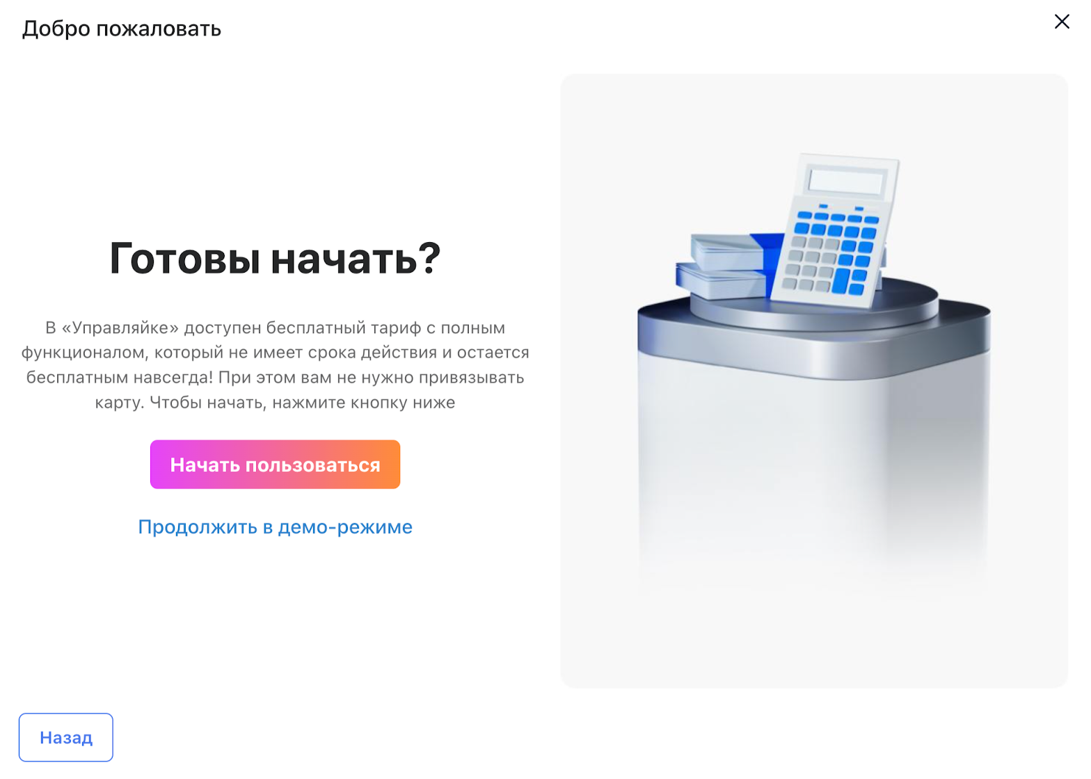 Начните знакомство с Управляйкой с короткого онбординга. Чтобы запустить короткую презентацию о ключевых действиях, нажмите «Начать» вверху экрана. Двигайтесь через кнопку «Далее».